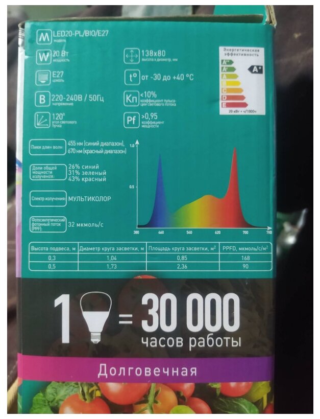 | Дополнительная информация | спектр излучения: биколор; доли общей мощности излучения: 23% - синий, 77% - красный; фотосинтетический фотонный поток, мкмоль/с: 18 |