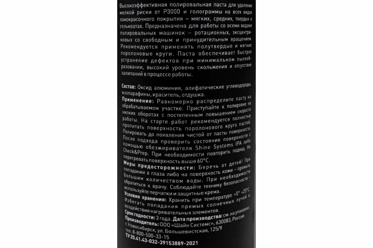 | Способ применения | равномерно распределите пасту на обрабатываемом участке, приступайте к полировке на низких оборотах с постепенным повышением скорости работы, на старте работ рекомендуется полностью пропитать поверхность поролонового круга пастой, полировать до появления чистой от пасты поверхности, после подхода проверить состояние поверхности с помощью обезжирки Shine Systems IPA либо Check&Prep, при необходимости повторить подход, не перегревать поверхность выше 60 градусов |