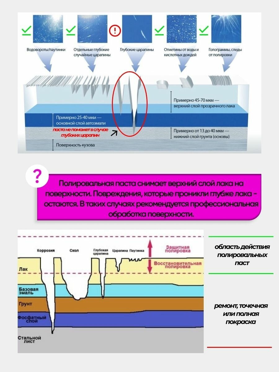 | Действие | защищает ЛКП, придает блеск, маскирует царапины, устраняет царапины, устраняет голограммы |