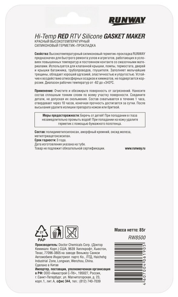 Силиконовый высокотемпературный герметик RUNWAY RW8500 красный, 85 г 54977 интересное:
