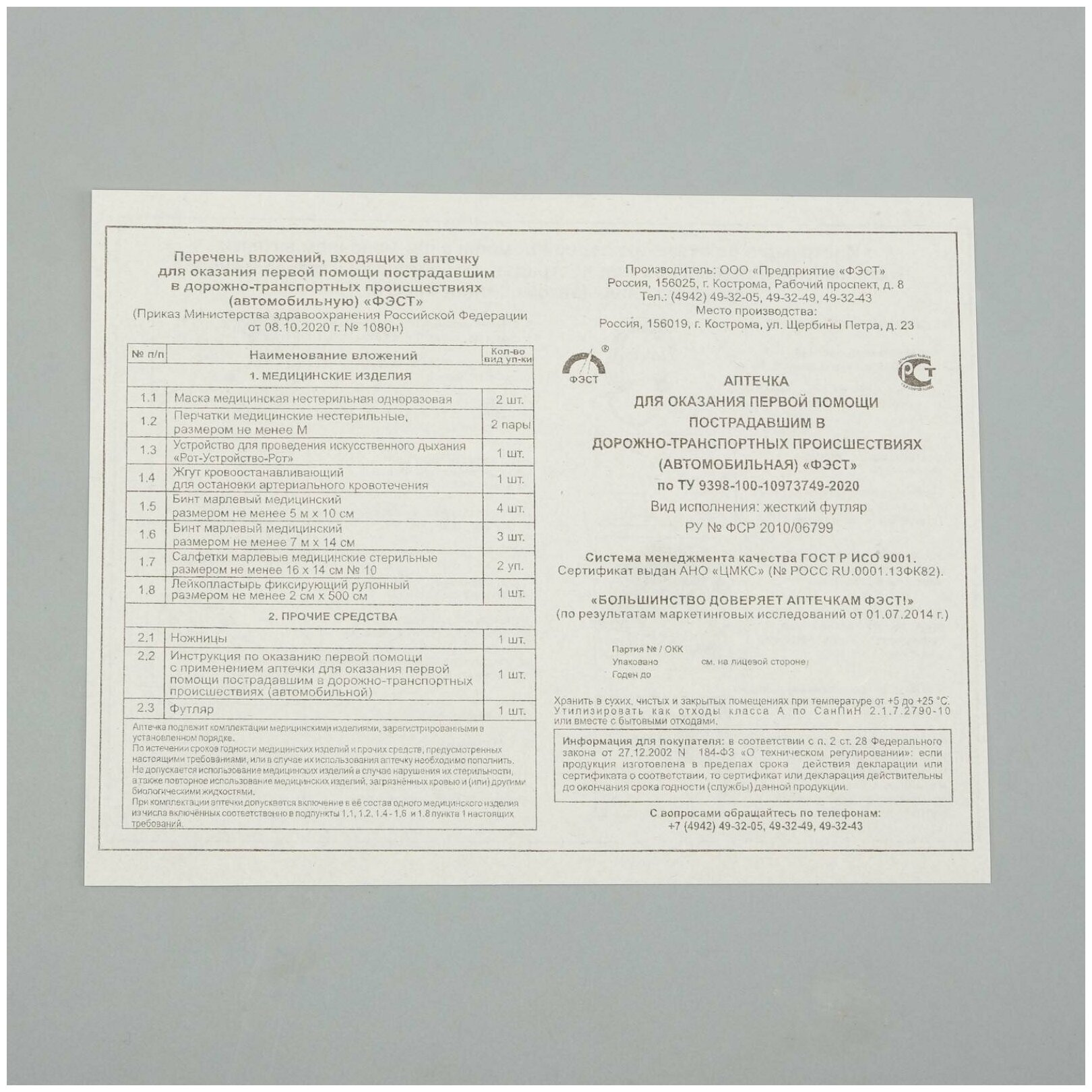 Аптечка автомобильная ФЭСТ футляр из полистирола, новый состав по приказу № 1080Н от 08.10.20