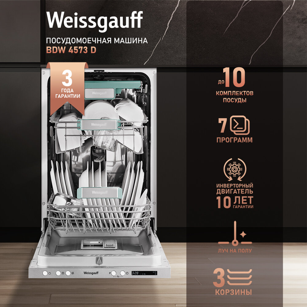 Встраиваемая посудомоечная машина WEISSGAUFF BDW 4573 D, узкая, ширина 44.8см, полновстраиваемая, загрузка 10 комплектов интересное: