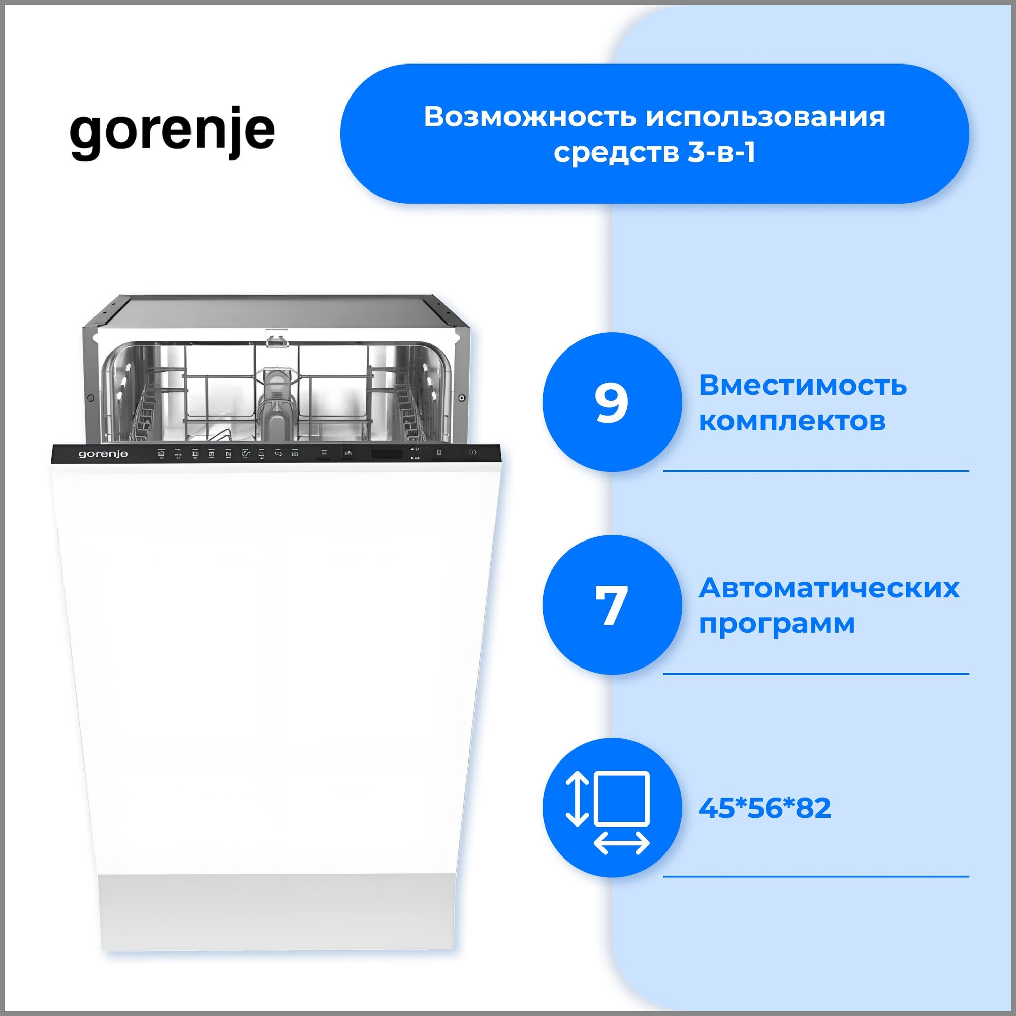 Встраиваемая посудомоечная машина Gorenje GV52041, 45 см, до 9 комплектов посуды, 7 программ, функция "3 в 1"
