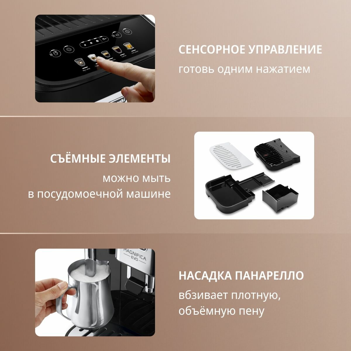 Сенсорное управление каждый раз радует, нет кнопок, под которыми забивается грязь. Поверхность кофемашины легко мыть, застывшие капли молока легко убираются влажной тряпкой. |