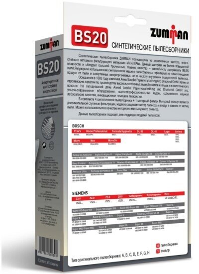 | Совместимые модели | Bosch BBS 1, Bosch BBS 5, Bosch BBS 6, Bosch BBS 7, Bosch BBS 8, Bosch Ergomaxx’x BGB7, Bosch Ergomaxx’x BGL722, Bosch Formula Hygienixx BSG7, Bosch GL-20 BGB1, Bosch GL-20 BGB2, Bosch GL-20 BGL1, Bosch GL-20 BGL2, Bosch GL-20 BGN1, Bosch GL-35 SportLine MoveON BGL35SPORT, Bosch GL-80 BGB8, Bosch GL-80 BGL8, Bosch Logo BSG6, Bosch Move BSGL2MOVE, Bosch MoveON Mini BGL25, Bosch Sphera BSA2, Bosch Sphera BSA3, Bosch Sphera BSB2, Bosch Sphera BSD2, Bosch Sphera BSD3, KARCHER VC 5100, KARCHER VC 5200, KARCHER VC 5300, KARCHER VC 6100, KARCHER VC 6200, KARCHER VC 6300, Siemens Dino VS 5.A(B)(C)(E).., Siemens Synchropower VS06G…., Siemens VS 04G...., Siemens VS 06G...., Siemens VS 07G...., Siemens VS10..., Siemens VS 32A(B).., Siemens VS 33A(B).., Siemens VS 42A(B)..-VS 44A(B), Siemens VS 5...., Siemens VS 5.A(B)(C)(E).., Siemens VS 69…, Siemens VS 6.A.., Siemens VS 7 ..., Siemens VS 81A.., Siemens VS 9.A.., Siemens Z3.0 VSZ3, Siemens Z4.0 VSZ4, Siemens Z5.0 VSZ5, Siemens Z6.0 VSZ6 |