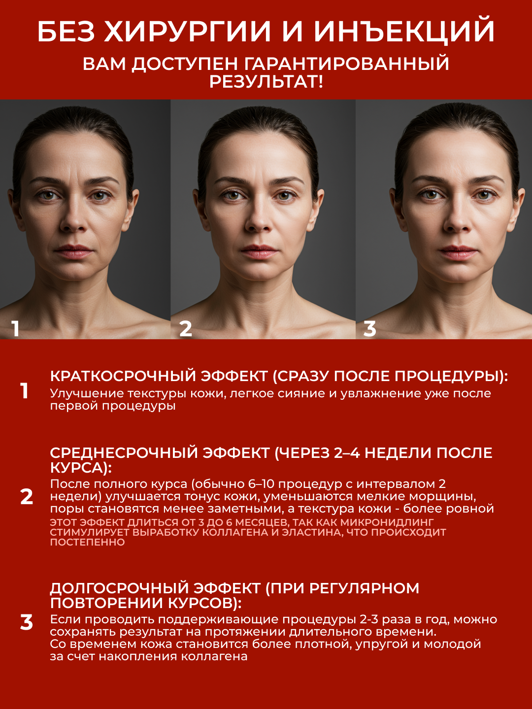 | Эффект | осветление пигментных пятен / повышение упругости кожи / удаление рубцов и шрамов |