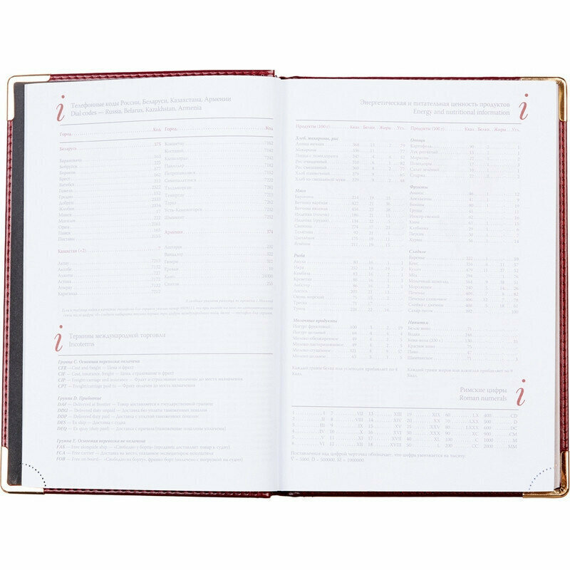 | Особенности | металлические уголки на обложке / справочная информация / ляссе / прошивка по периметру обложки / цветной обрез |