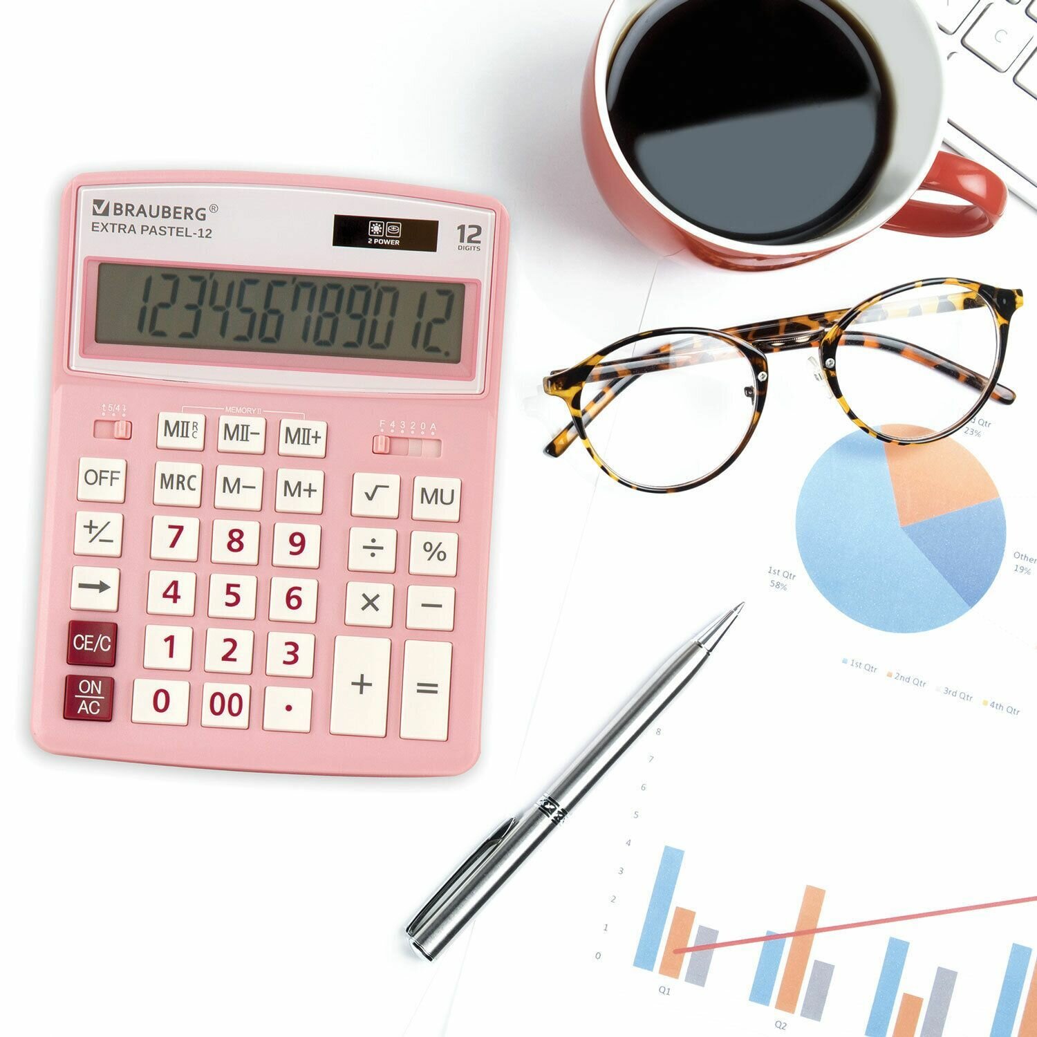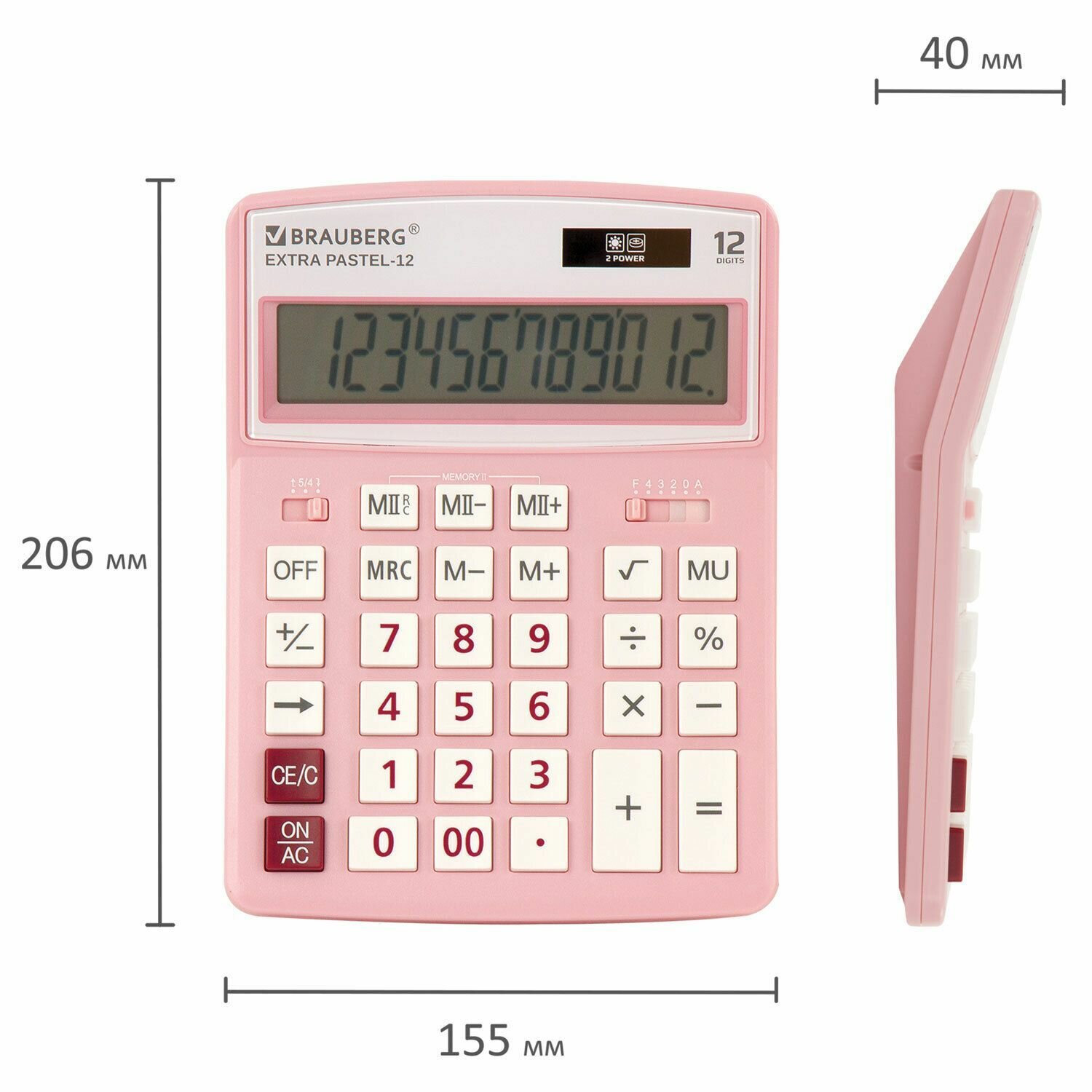 Калькулятор настольный Brauberg EXTRA PASTEL-12-PK (206x155 мм), 12 разрядов, двойное питание, розовый, 250487