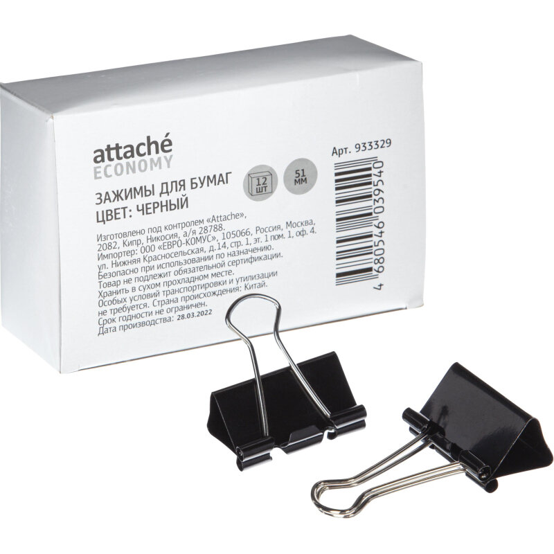 933329 Attache Зажим для бумаг 51мм 12шт/уп Economy, в карт,кор, цвет чёрный 933329 .