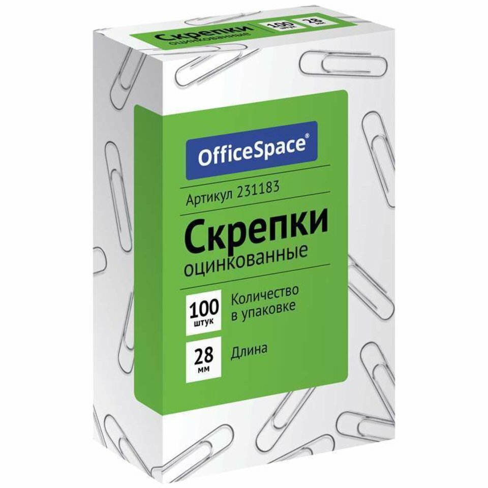 Скрепки OfficeSpace 28 мм, 100 штук, оцинкованные, картонная упаковка (231183)