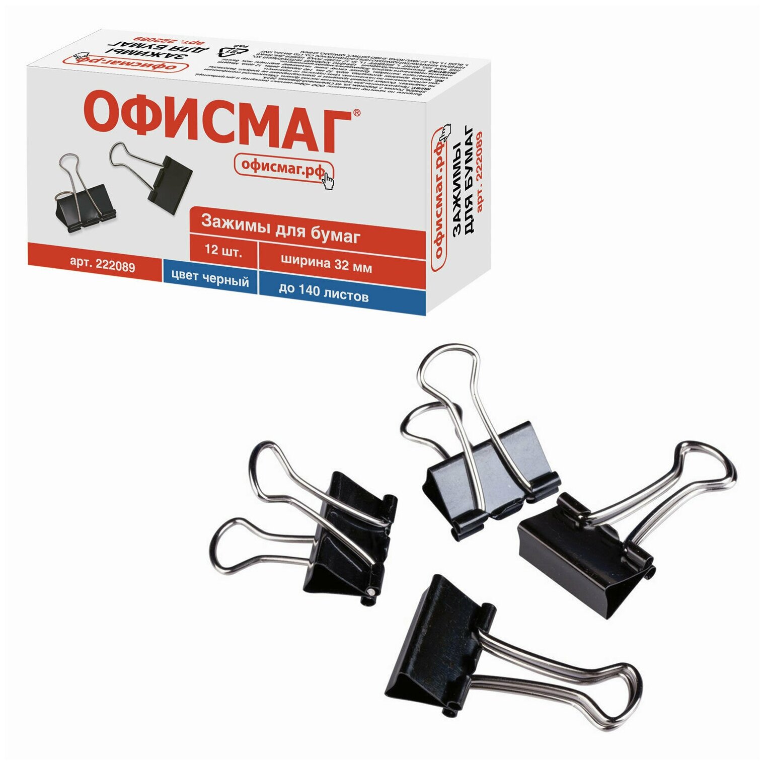 Зажимы для бумаг офисмаг, комплект 12 шт., 32 мм, на 140 листов, черные, картонная коробка, 222089 - 1 шт.