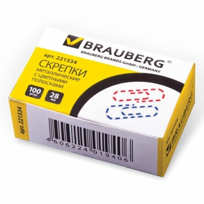 Скрепки BRAUBERG, 28 мм с цветными полосками, 100 шт., в картонной коробке, 221534, 221534