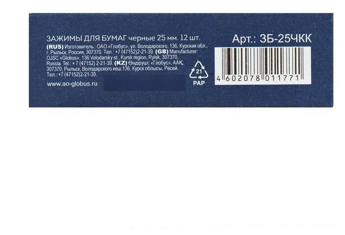 Зажим для бумаг 25мм 12шт/уп Глобус в карт.кор, цвет чёрный ЗБ-25ЧКК, 1164816