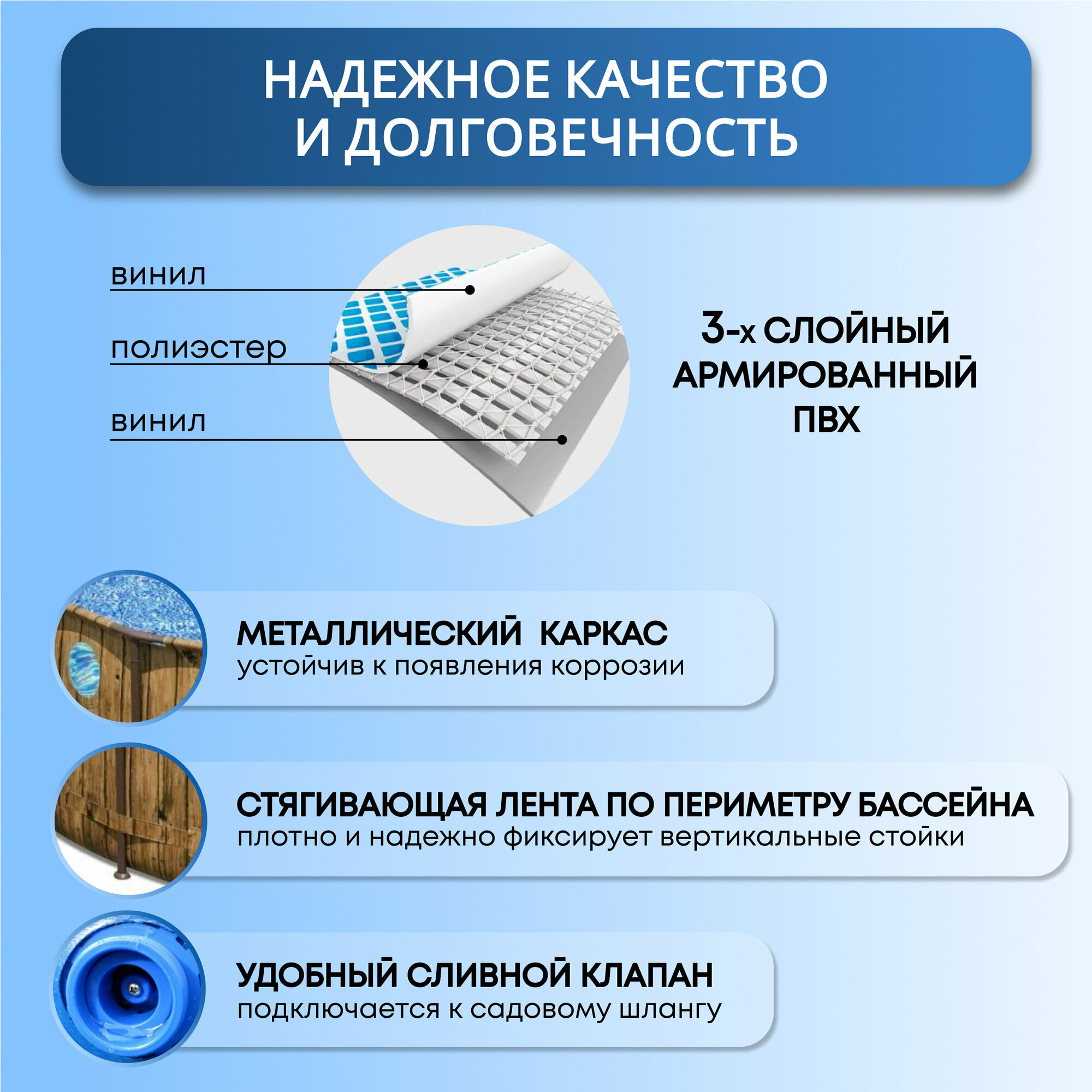 | Минусы: | Нет подложки под бассейн |