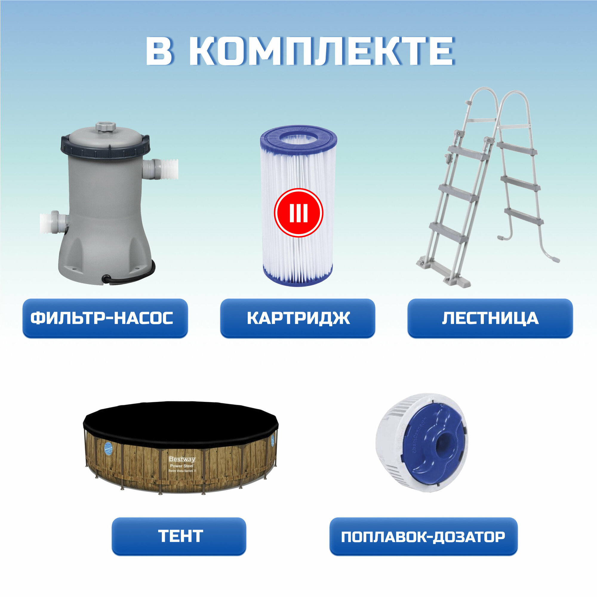 | В комплекте | подстилка под бассейн / тент / лестница / Насос в комплекте / Фильтр |
