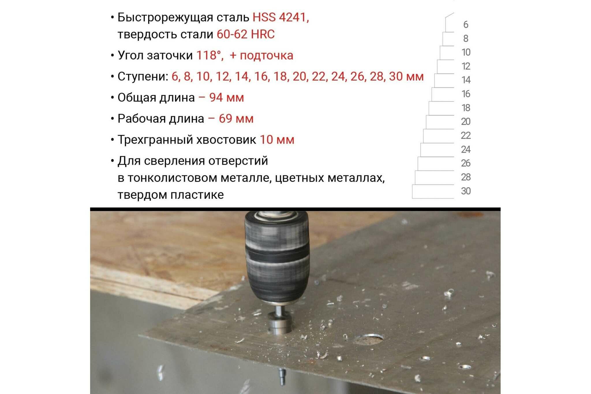Сверло по металлу vira ступенчатое 6-30мм шаг 2мм 13 ступеней