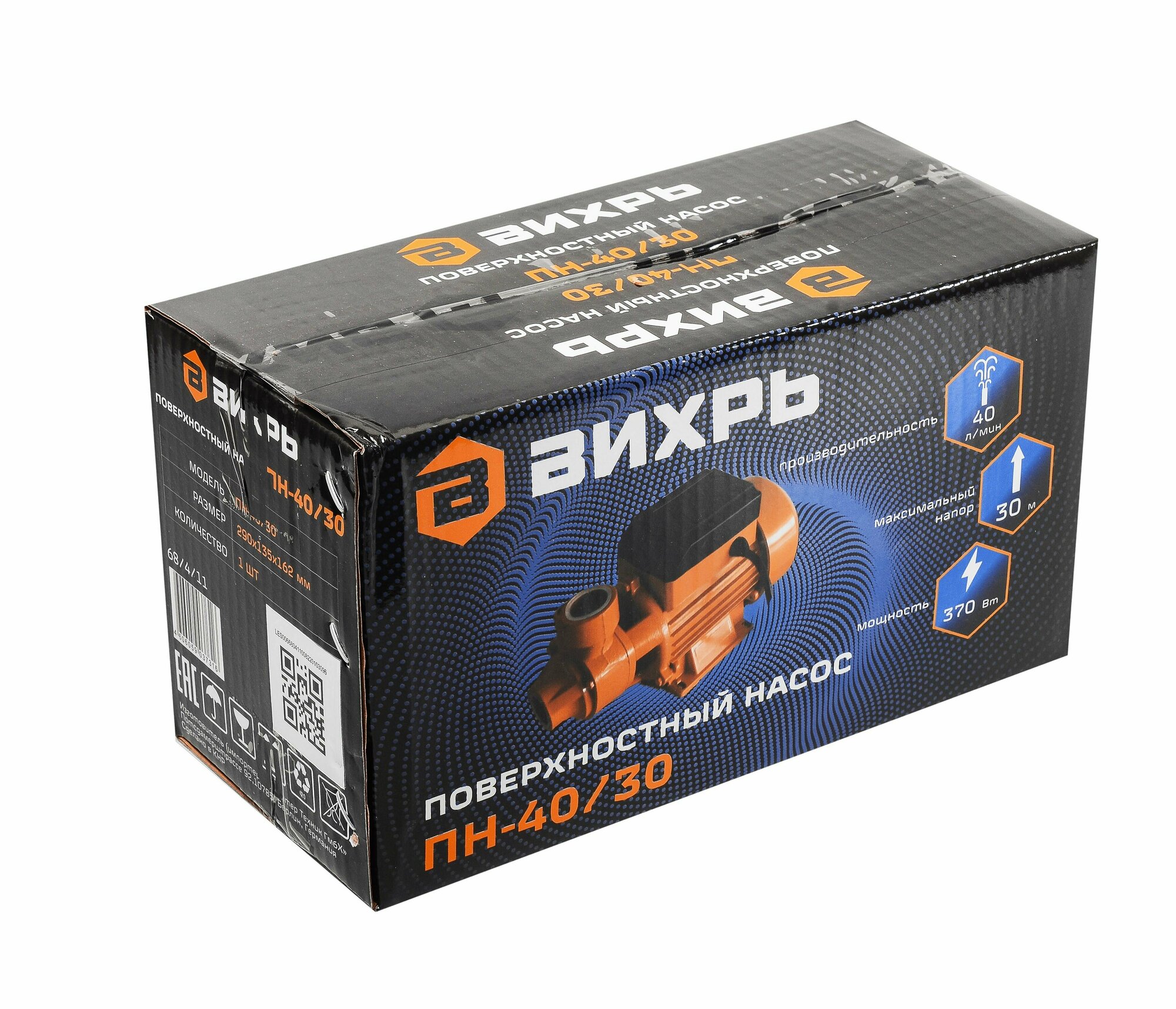 Насос / Поверхностный насос Вихрь ПН-40/30 (370 Вт, высота подъема – 30 м, 40 л/мин, G1”, корпус двигателя – чугун, глубина всасывания – 9 м)
