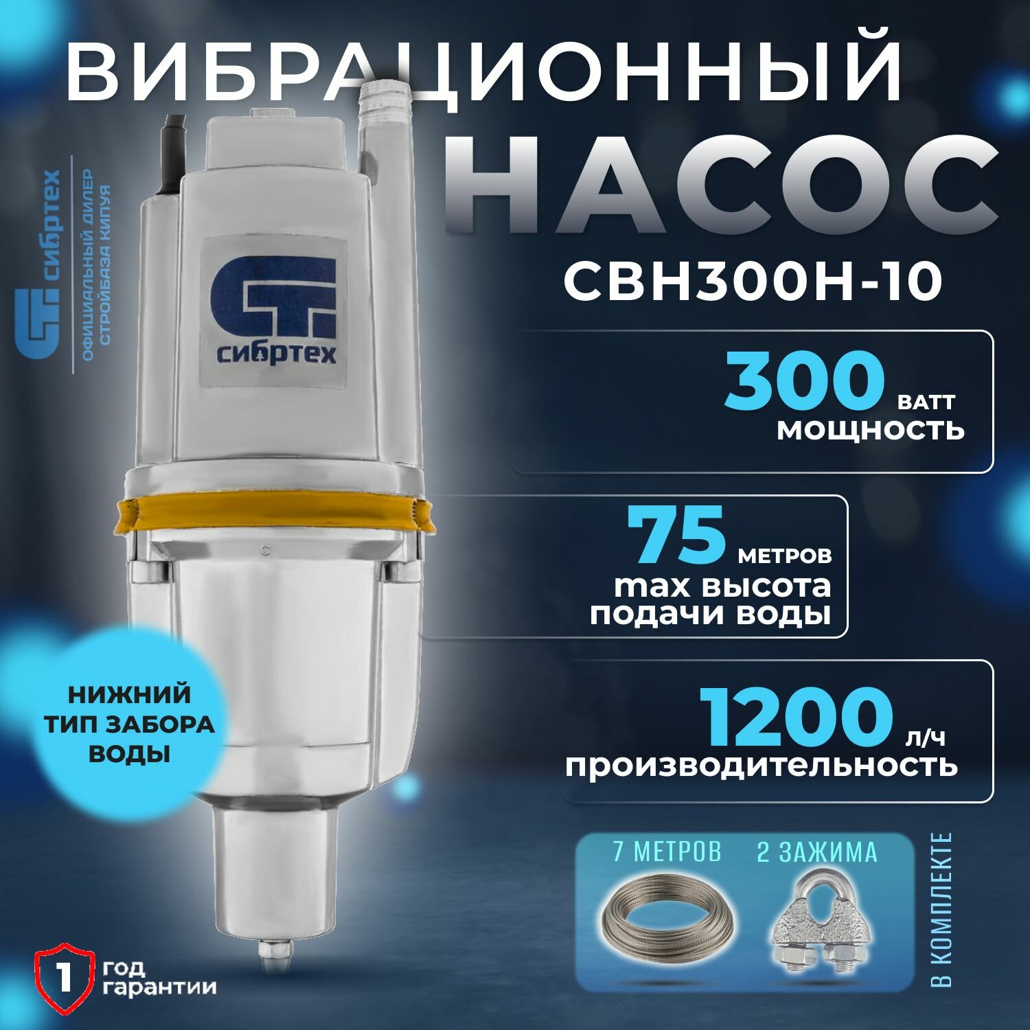 Вибрационный насос СВН300Н-10, нижний забор, 300 Вт, напор 75 м, 1200 л/ч, кабель 10 м Сибртех, арт. 99305