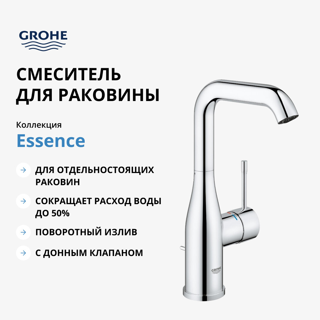 Смеситель для раковины GROHE Essence+ с донным клапаном и высоким изливом, хром (32628001)