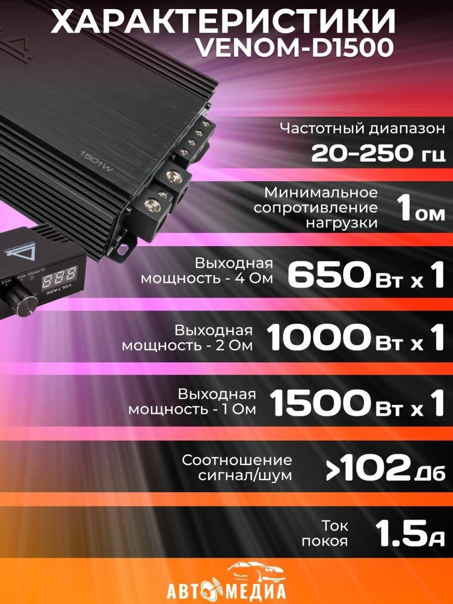Автомобильный усилитель AURA VENOM D1500 1-канальный / класс D