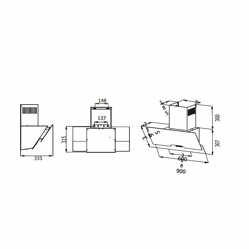 EVELUX Вытяжка наклонная EVELUX вытяжка, 60 см, механический контроль, 3 скорости работы, производительность 900 м3/ч, LED освещение, черный, металл, стекло, 600х335х395-607 мм.