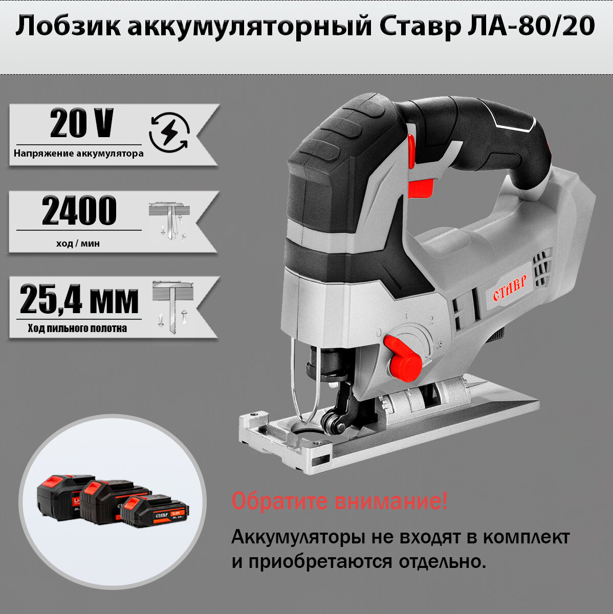 Ставр ЛА-80/20 (4шт) Лобзик аккумуляторный 20Вольт (без аккумулятора и зарядного устройства) , частота хода 0-2400хода/ мин, угол реза до 45град в обе стороны, быстрозажимной патрон, макс глубина пропила 80мм