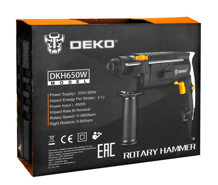 | Комплектация | перфоратор DEKO DKH650W 1 шт., сверло 3 шт., глубиномер 1 шт., кейс 1 шт. |