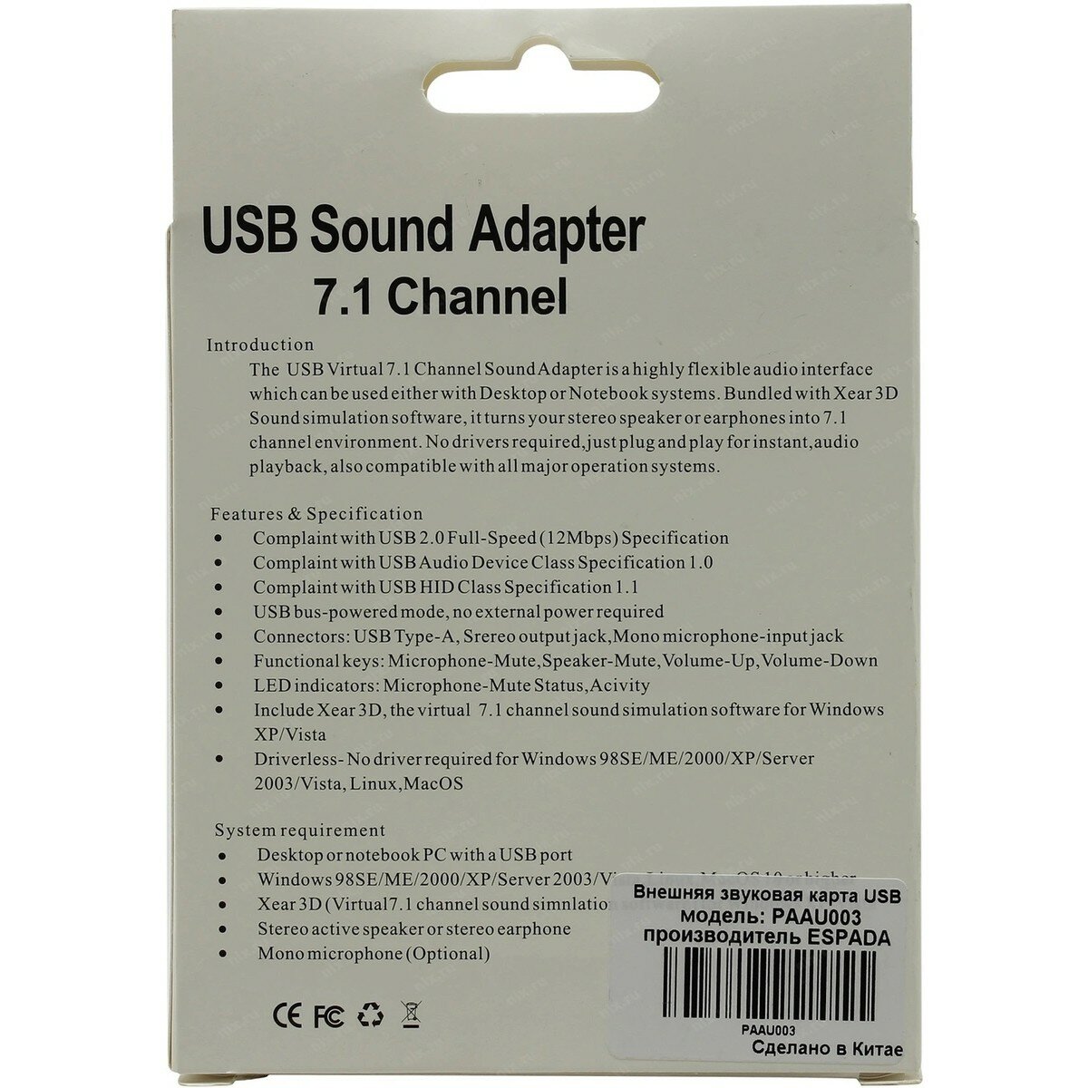Ниже Вы можете прочитать отзывы на Портативная внешняя звуковая карта Espada PAAU003, ознакомится с подробными характеристиками, посмотреть интересные обзоры и фотографии на Портативная внешняя звуковая карта Espada PAAU003.