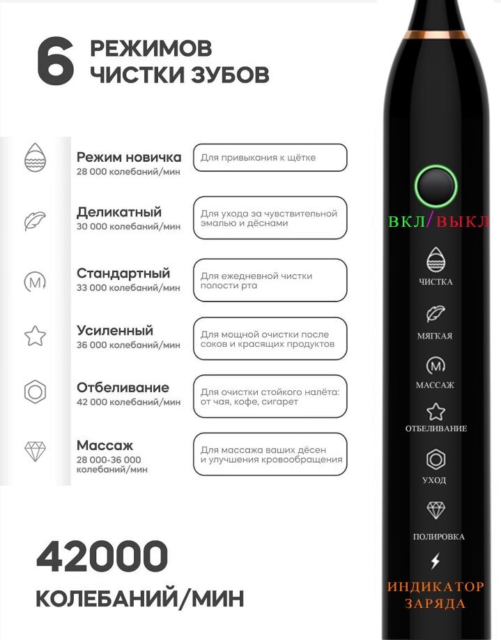 | Режимы работы | ежедневная чистка / уход за деснами / чистка языка |