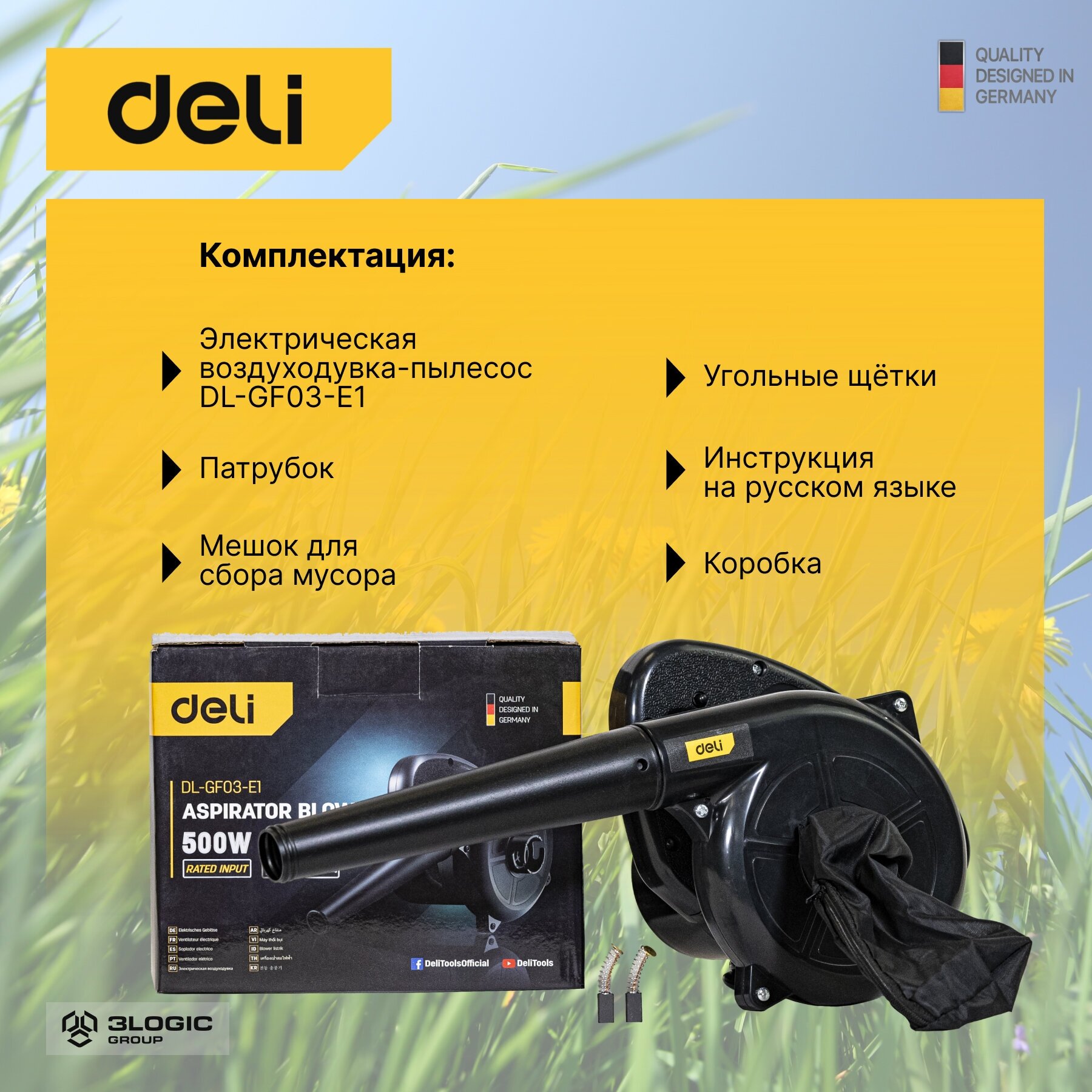 Воздуходувка-пылесос электрическая Deli DL-GF03-E1 (500Вт, 2 м3/мин, 13000 об/мин) DL-GF03-E1 .