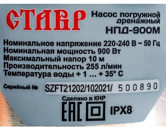 Ставр НПД-900М Насос погружной дренажный 900Вт, максимальная производительность 255л/мин