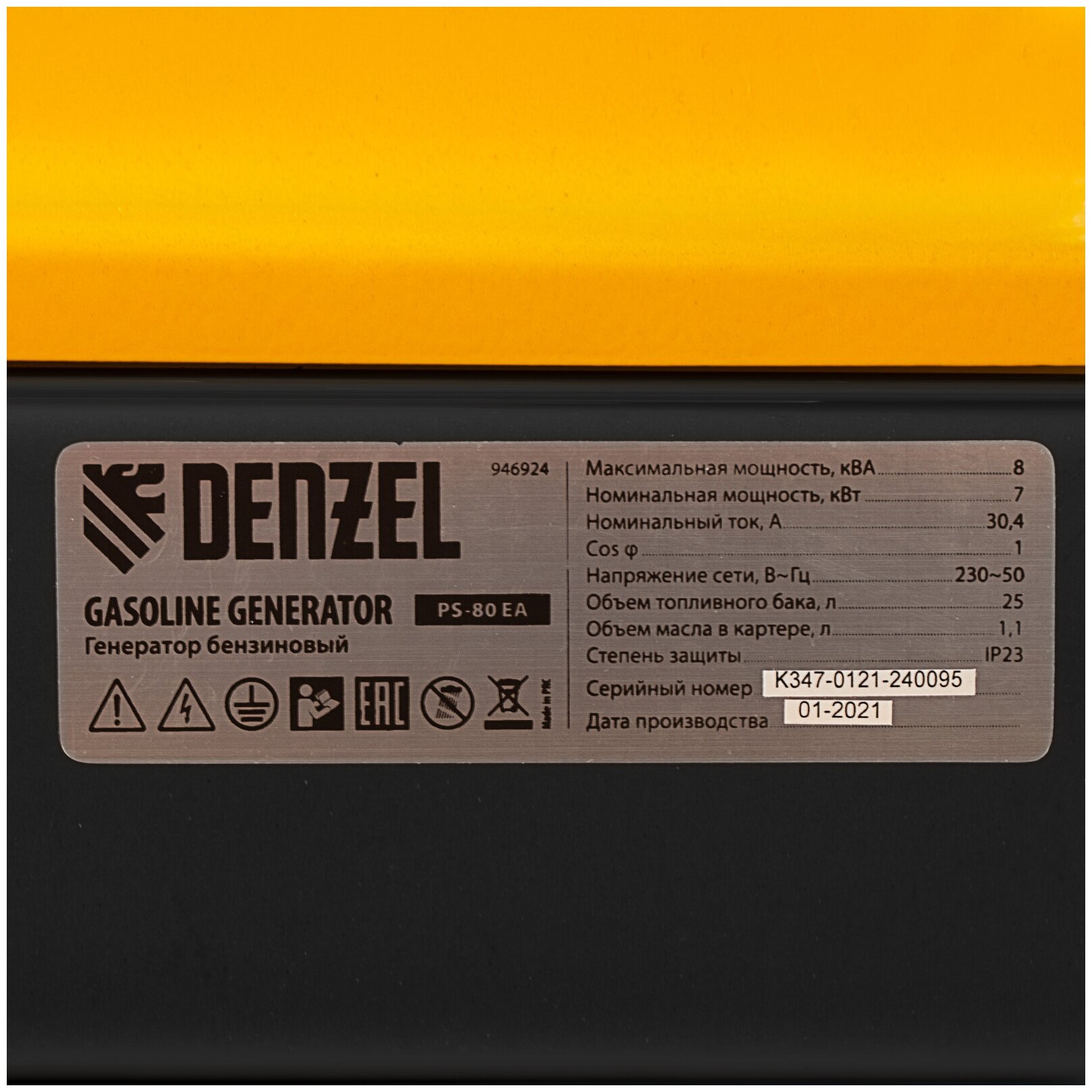 Denzel PS-80EA, 8,0 кВт, 230В, 25л, коннектор автоматики, электростартер (946924)