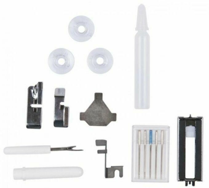 | Плюсы: | весь набор основных операций, набор лапок, несколько шпулек для ниток, съемный рабочий стол - удобно для пройм и рукавов |