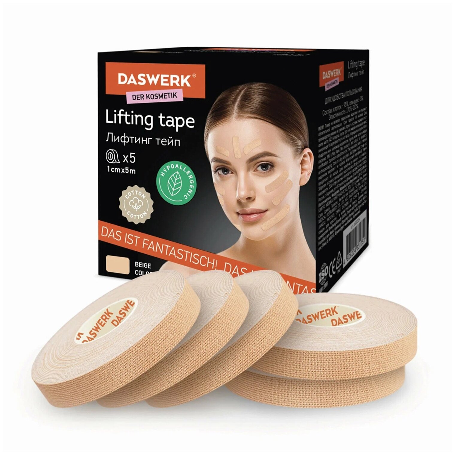 Кинезио Daswerk тейп/лента для лица, лифтинг эффект, 2,5 см х 5 м, комплект, 2 рулона, бежевый, , 680012