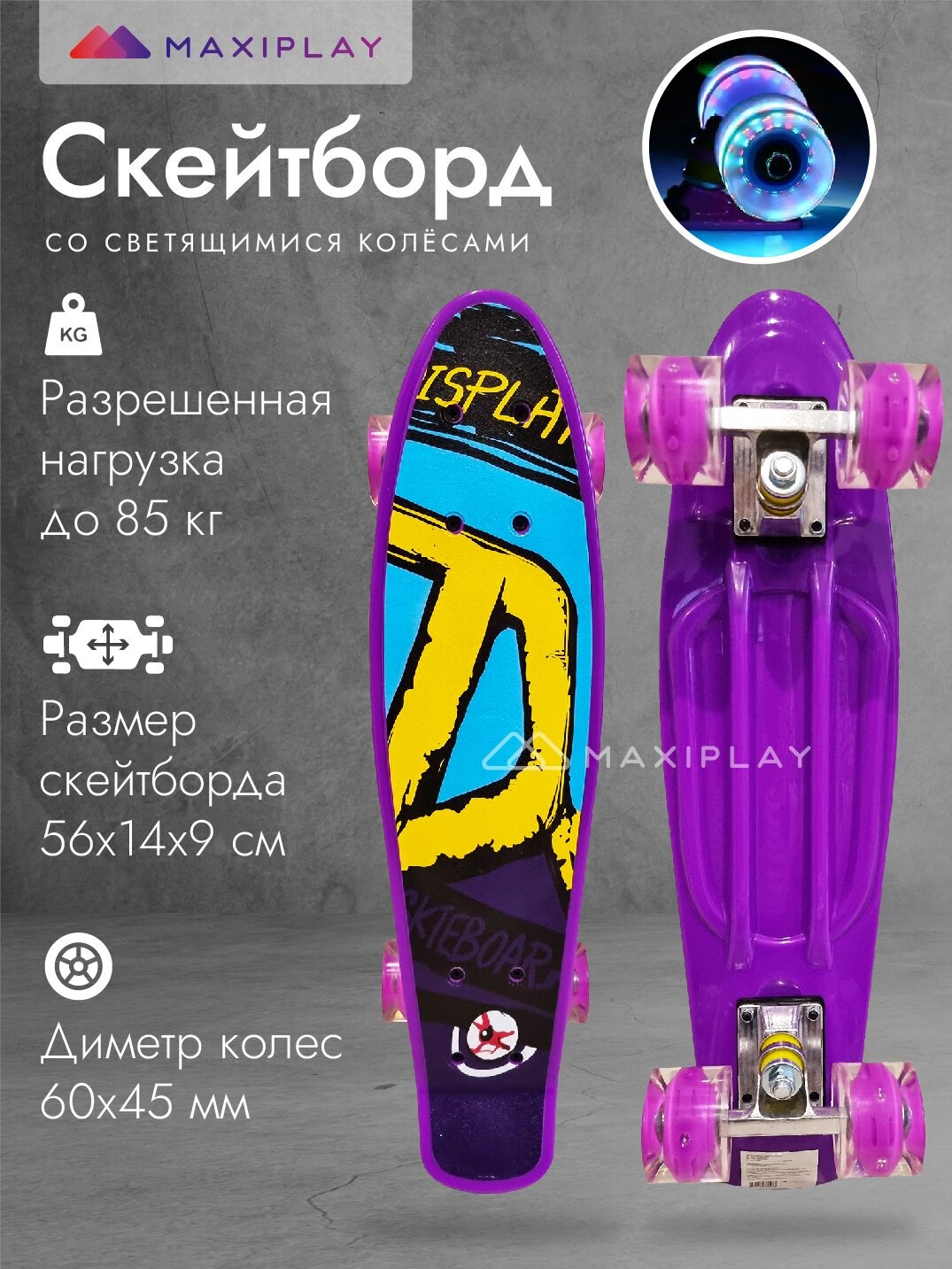 Скейтборд со светящимися колесами городской с антискользящим покрытием деки пластиковый, 56 см