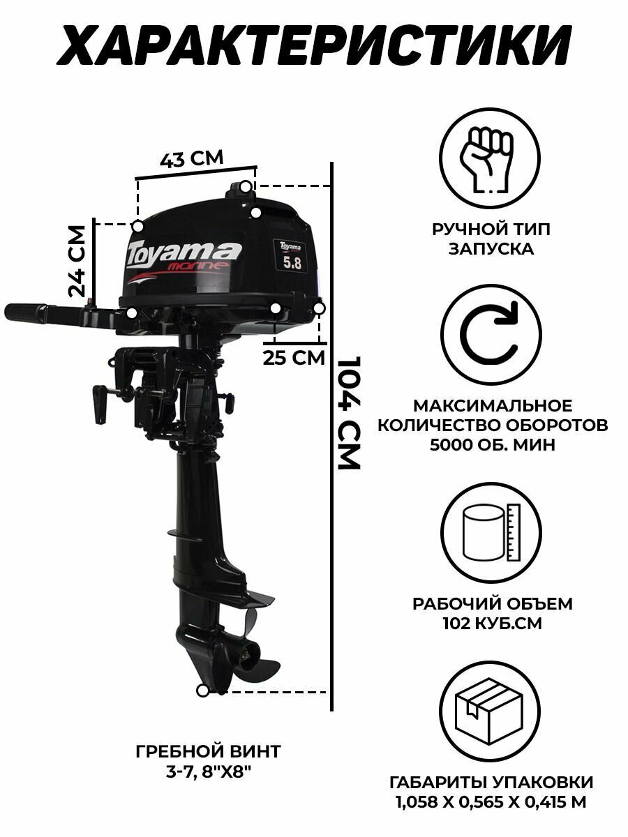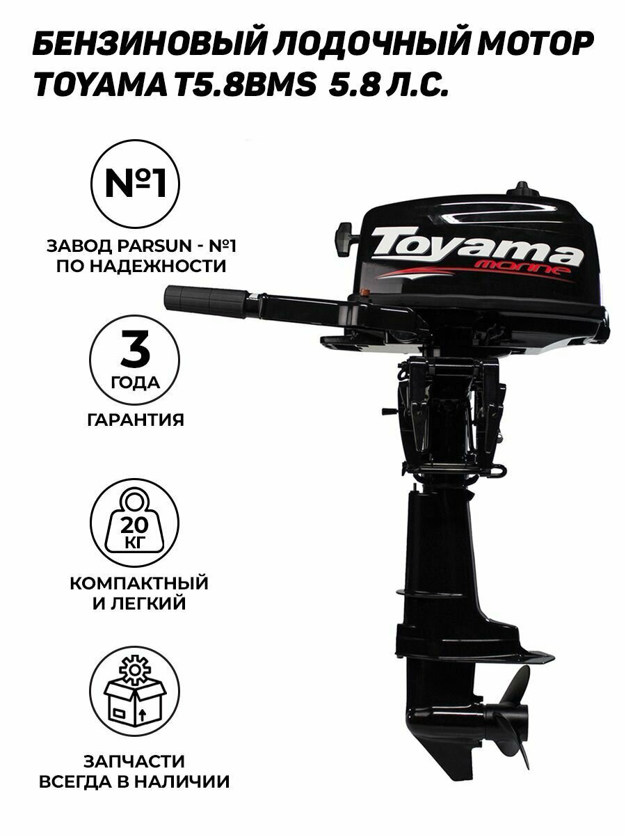Лодочный мотор TOYAMA T5.8BMS, бензиновый, 5,8 л.с., 102 куб.см, 2 тактный, 4 кВт