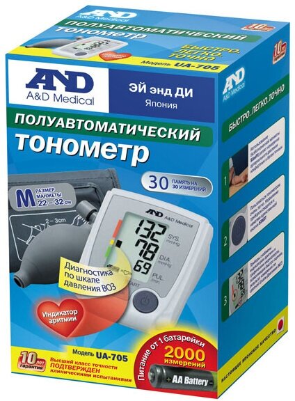 Полуавтоматический тонометр AND UA-705 / стандартная манжета 22-32 см / индикатор аритмии / память на 30 измерений / большой дисплей