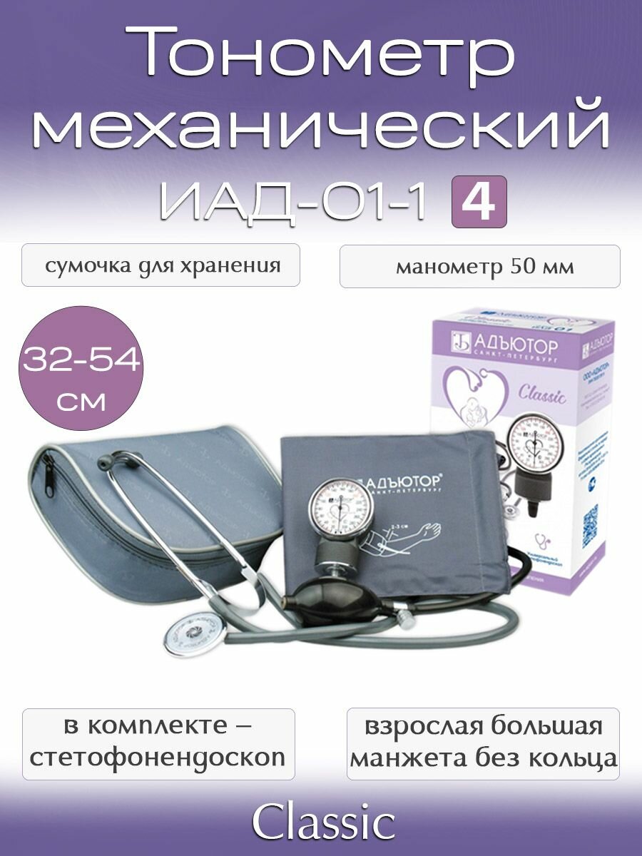 Тонометр механический Адъютор ИАД-01-1, серия Classic, комплект.4 (стетофонендоскоп СФ-01,манжета взрослая большая 32-54см без кольца) интересное: