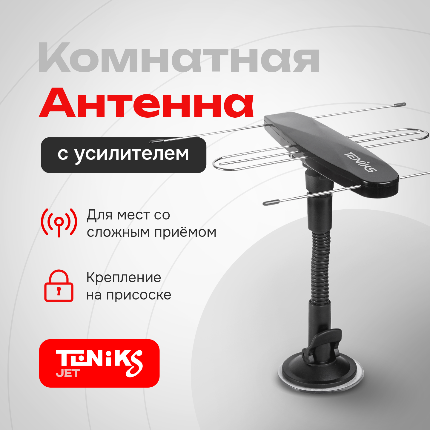| Дополнительная информация | Телевизионная комнатная антенна Teniks отлично подходит для приема сигнала в стандарте DVB-T2 и рекомендуется в сочетании с ресиверами Teniks. Инновационное вакуумное крепление JET S позволит закрепить антенну практически на любой поверхности. Цвет - белый. |