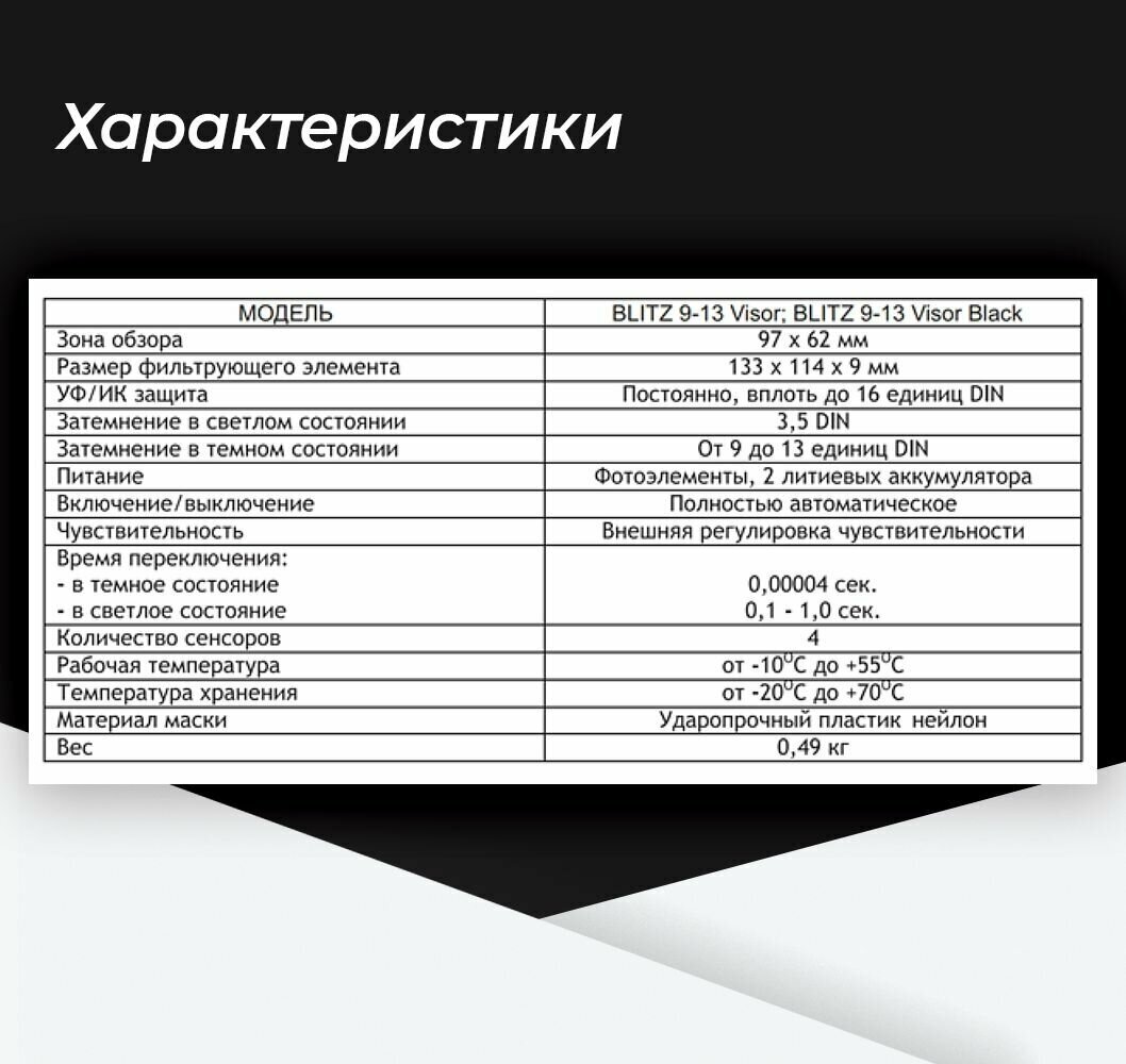 Маска сварщика "Хамелеон" с регулирующимся фильтром BLITZ 9-13 Visor Black
