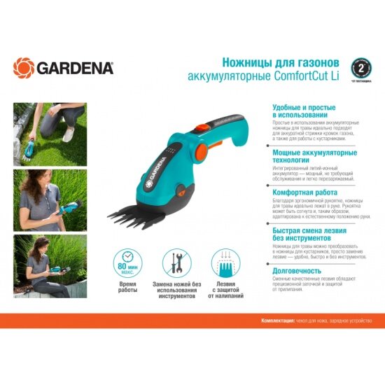 | Комплектация | ножницы, нож для травы, чехол для ножа, встроенный аккумулятор, зарядное устройство |