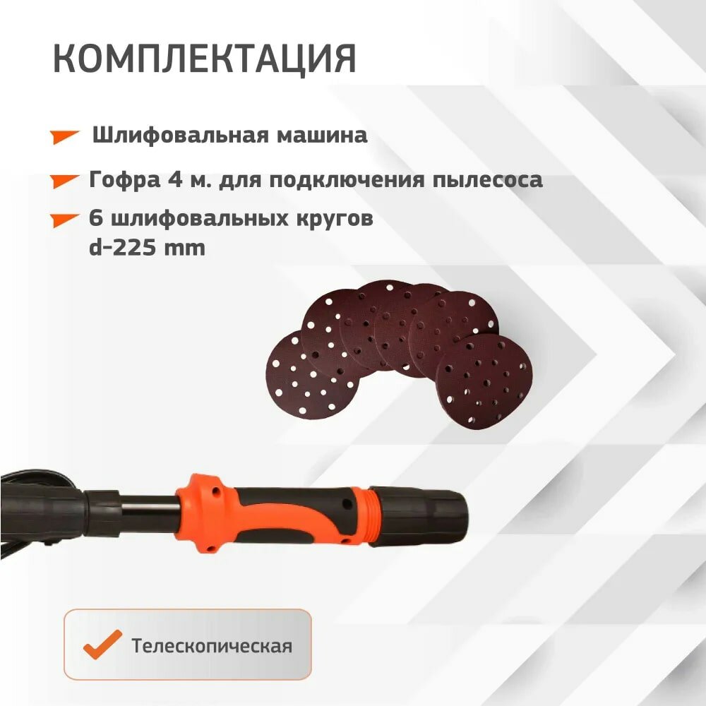 Шлифмашина для стен и потолков, жираф FANG TOOLS 225мм с подсветкой и встроенным пылесосом + 5 шлифовальных кругов