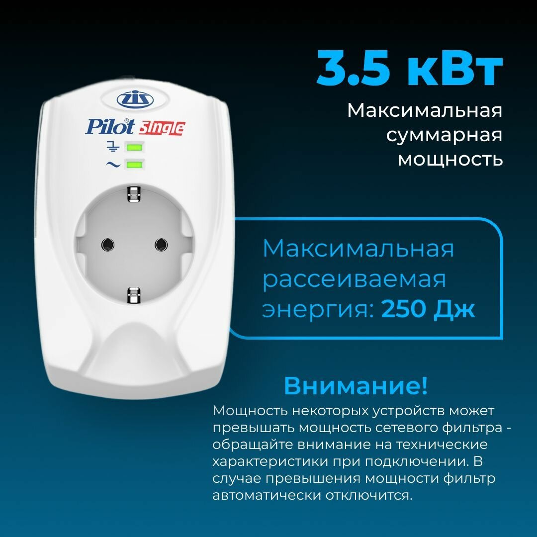 Сетевой фильтр Pilot Single, 1 розетка, Zero Start биметаллический предохранитель, микропроцессор (1 .