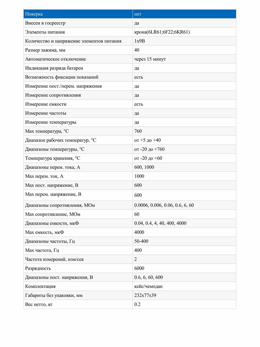 | Дополнительная информация | измерение емкости 4000мкФ; частоты 10MГц; подсветка дисплея; автоматическое отключение питания |