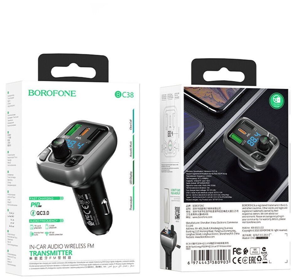 Автомобильный FM модулятор и фм трансмиттер с блютуз и быстрой зарядкой Borofone BC38