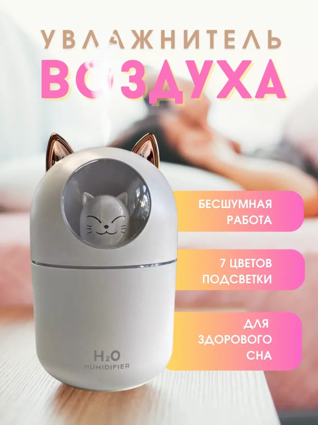 Увлажнитель воздуха мини Котик с подсветкой, ультразвуковой увлажнитель для дома, ночник светильник. Белый интересное: