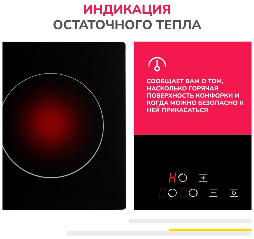 компактная, современный дизайн, с индикатором остаточного тепла, наличие защитного отключения