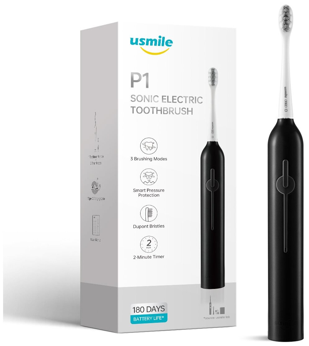 Электрическая зубная щетка usmile P1 Черный(ЕАС-сертификат), время автономной работы 180 дней, 3 режима