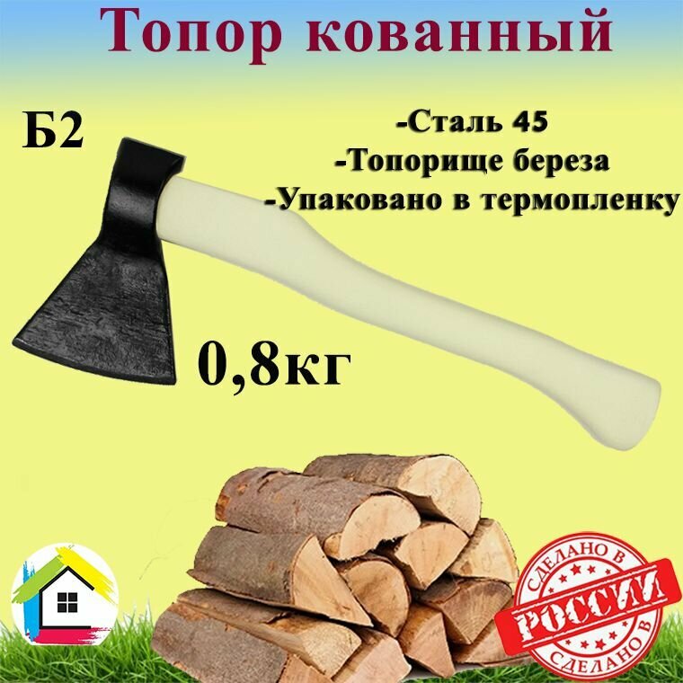 Топор хозяйственный кованый с деревянной рукояткой/ ТопАр 0,8 кг/Топорище 400мм из березы/с биозащитным составом/с порошковым покрытием/Б2