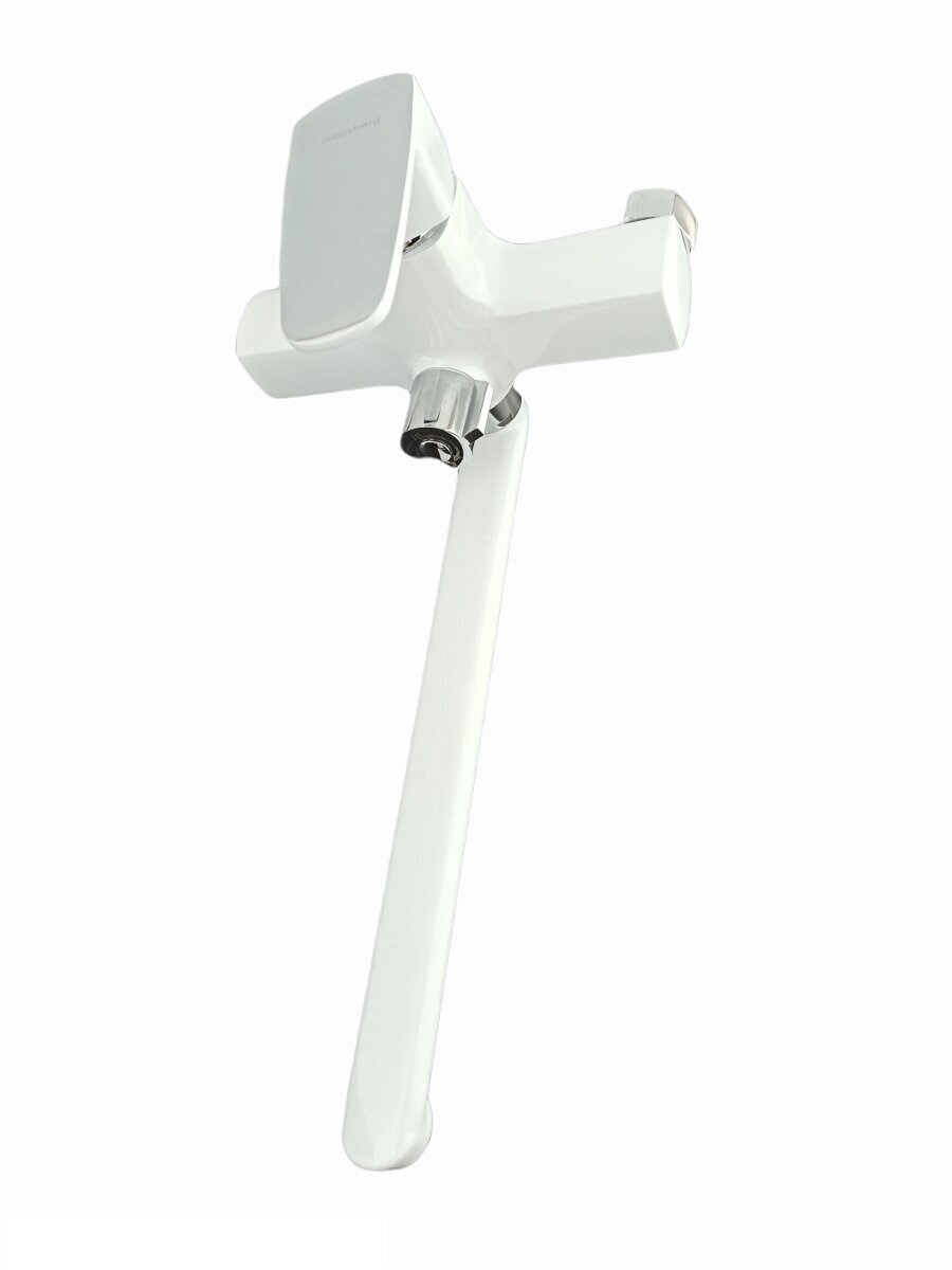 Купить Смеситель для ванны Rainsberg белый однорычажный, поворотный плоский 30 см. Переключатель (дивертор) с керамическими пластинами. Керамический картридж с двойным уплотнением 35 мм. Аэратор. Шланг 1.5 м.